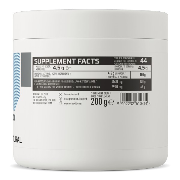 A-AKG — это уникальная комбинация L-аргинина и глутаровой кислоты. Глутаровая кислота, входящая в состав, является важным продуктом цикла лимонной кислоты, который обеспечивает метаболизм аэробных организмов. L-аргинин — это незаменимая аминокислота, необходимая для синтеза креатина и оксида азота (NO). Сочетание этих двух компонентов создает синергетический эффект, делая OstroVit A-AKG идеальным предтренировочным средством.